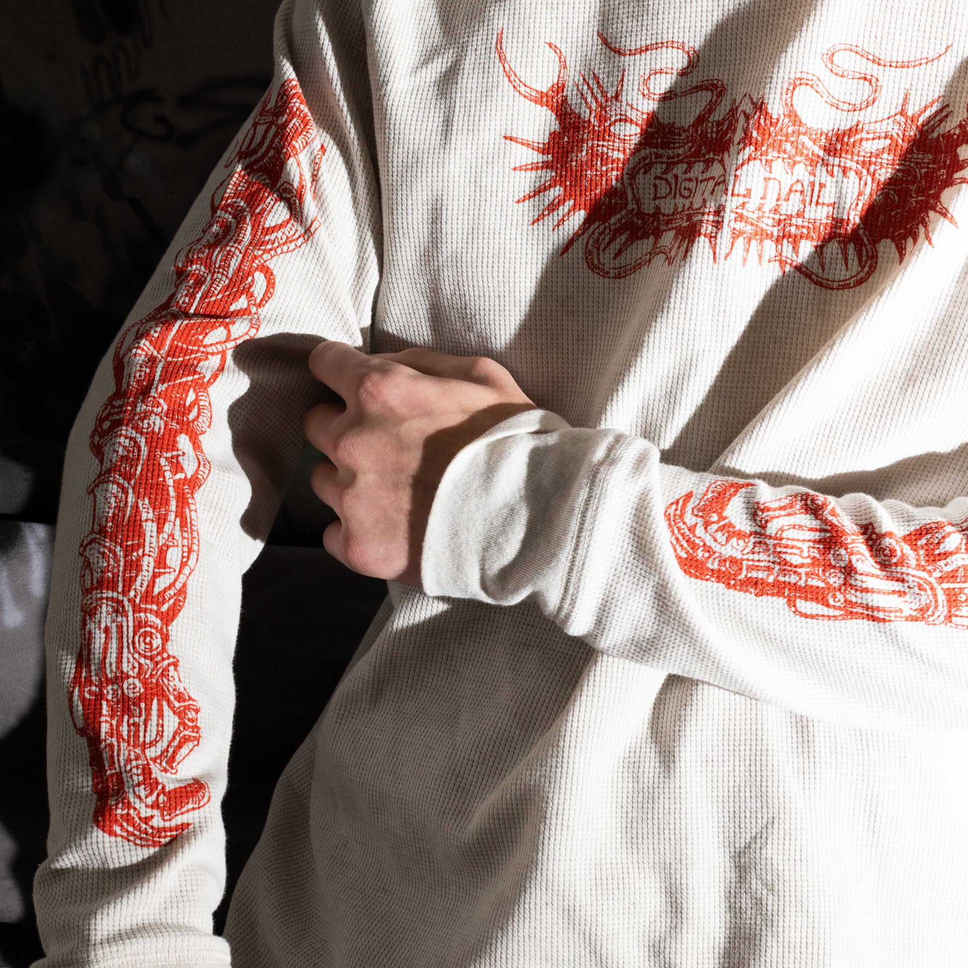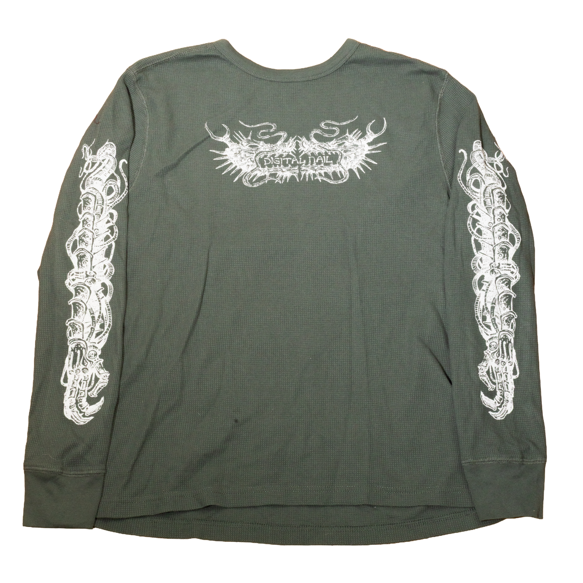 Waffle knit thermal long sleeve, with screen printed front and sleeve graphics.